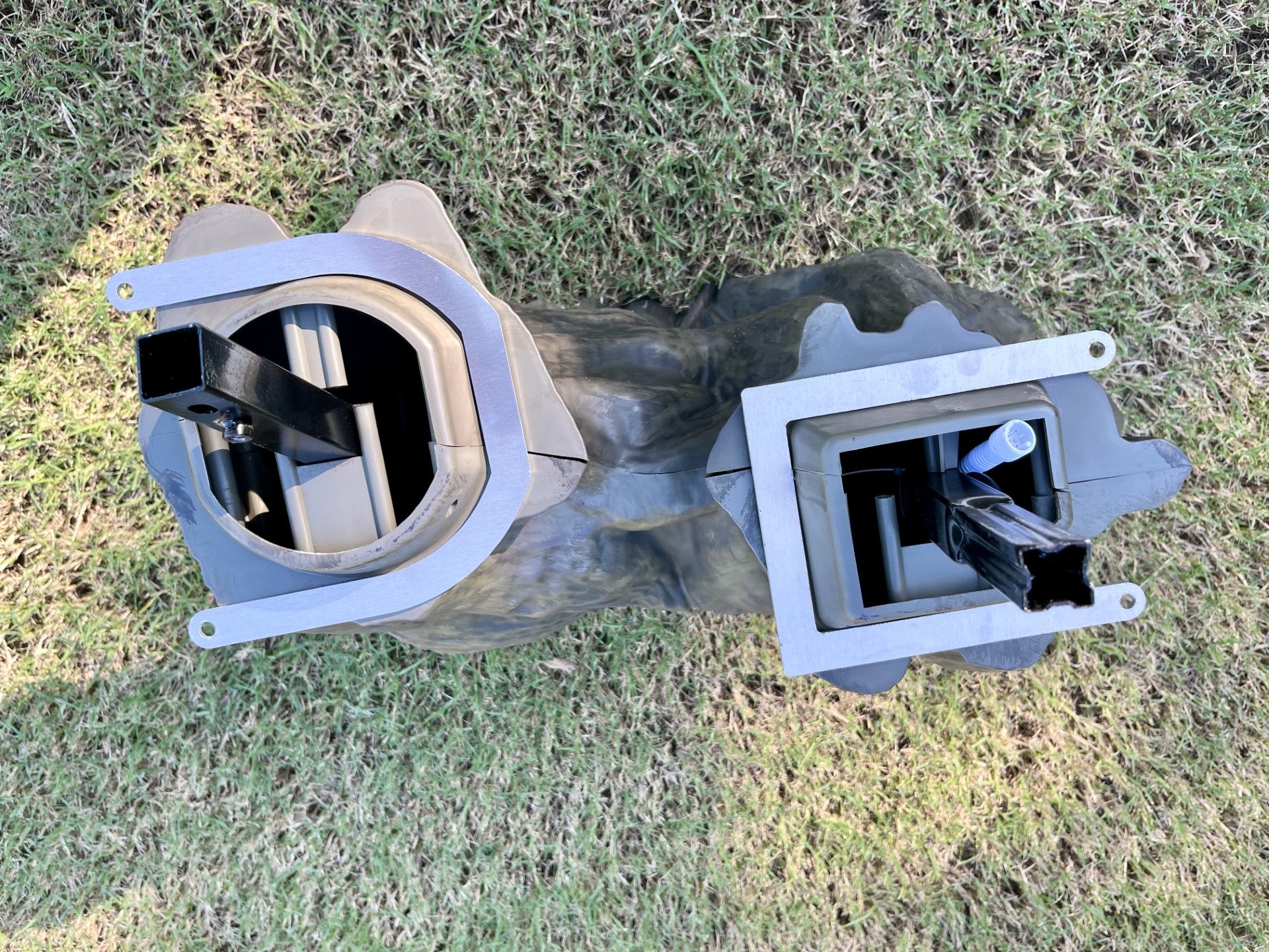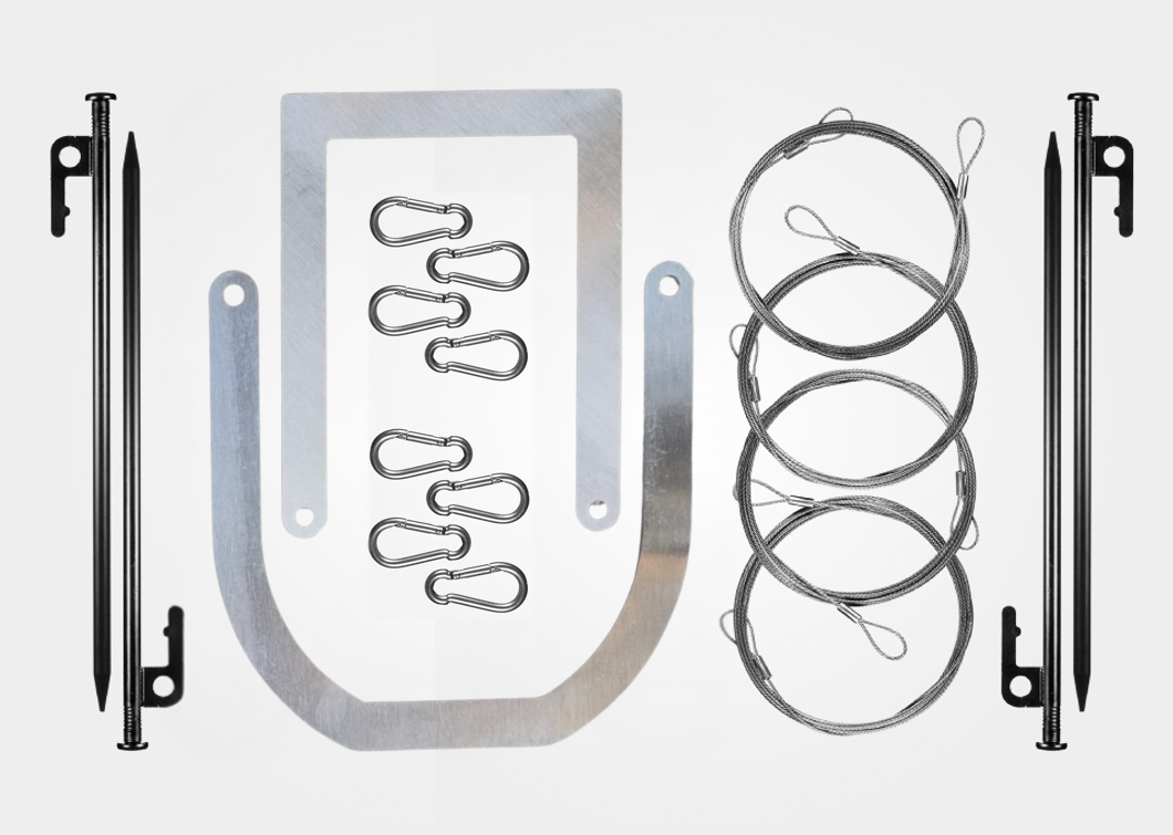 Full WorriCrow/GallyCrow Kit with Straight Stakes. *PLEASE READ FULL DESCRIPTION. Comes with a pair of Brackets, 4 heavy-duty straight stakes, 8 Carabiner-style Spring Snap Link clips, and 4 wire cables, each ~11 feet long, for securing to the ground or fixed objects. Brackets machined from Solid Aluminum and allow easy installation without any disassembly! Use to anchor for wind, provide attachment points for accessories, and even attach a padlock to help deter theft! Custom made for the Home Depot 15 Foot WorriCrow and GallyCrow variants.
